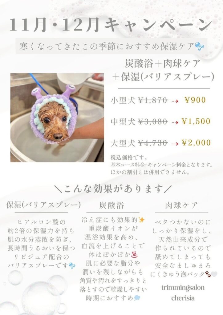 今回は寒くなってきたこの季節におすすめの保湿ケア『炭酸浴+肉球ケア+保湿(バリアスプレー)』です🫧